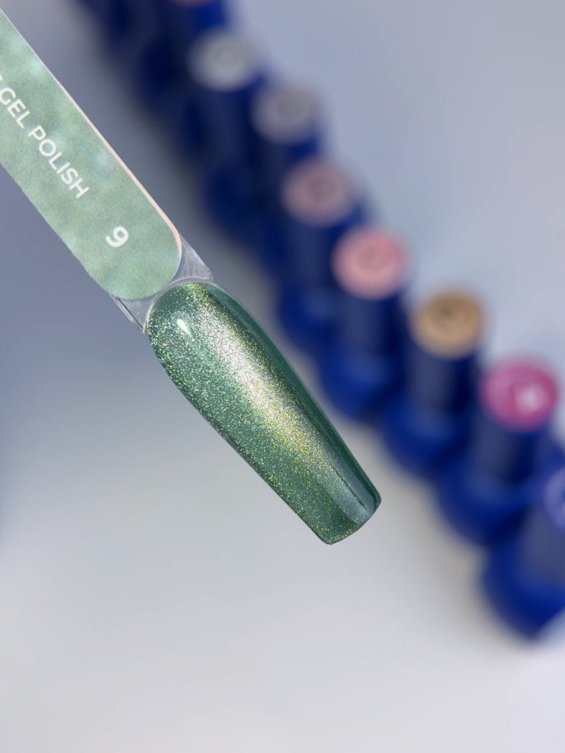 TOUCH 3D Cat Eyes Gel Polish 09 to zielony lakier hybrydowy z efektem kociego oka, który tworzy spektakularny, wielowymiarowy efekt 3D pod wpływem magnesu. Dzięki kamuflującej bazie oraz wysokiej koncentracji metalicznych drobinek stylizacja zyskuje głębię, intensywność i wyjątkowy, magnetyczny blask.